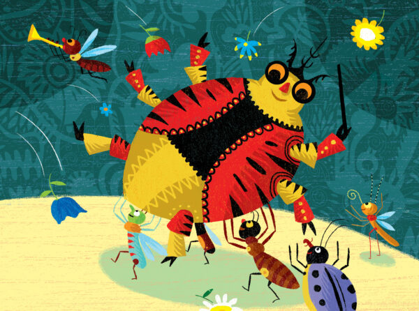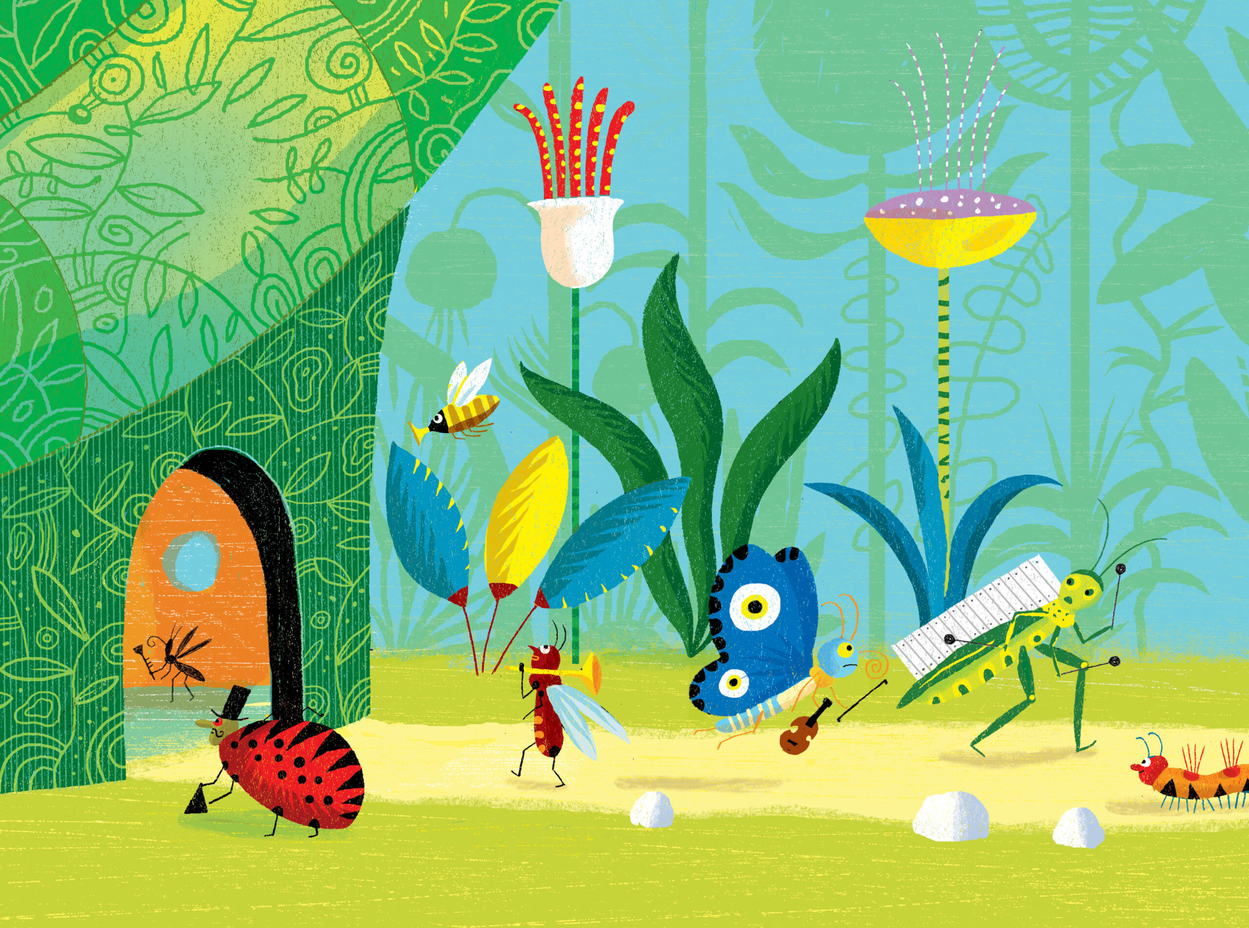 Crécelle la sauterelle joue du xylophone, Stradi le papillon du violon. C’est un grand jour ! Ils se présentent au concours le plus select, celui du Grand Orchestre des Insectes.